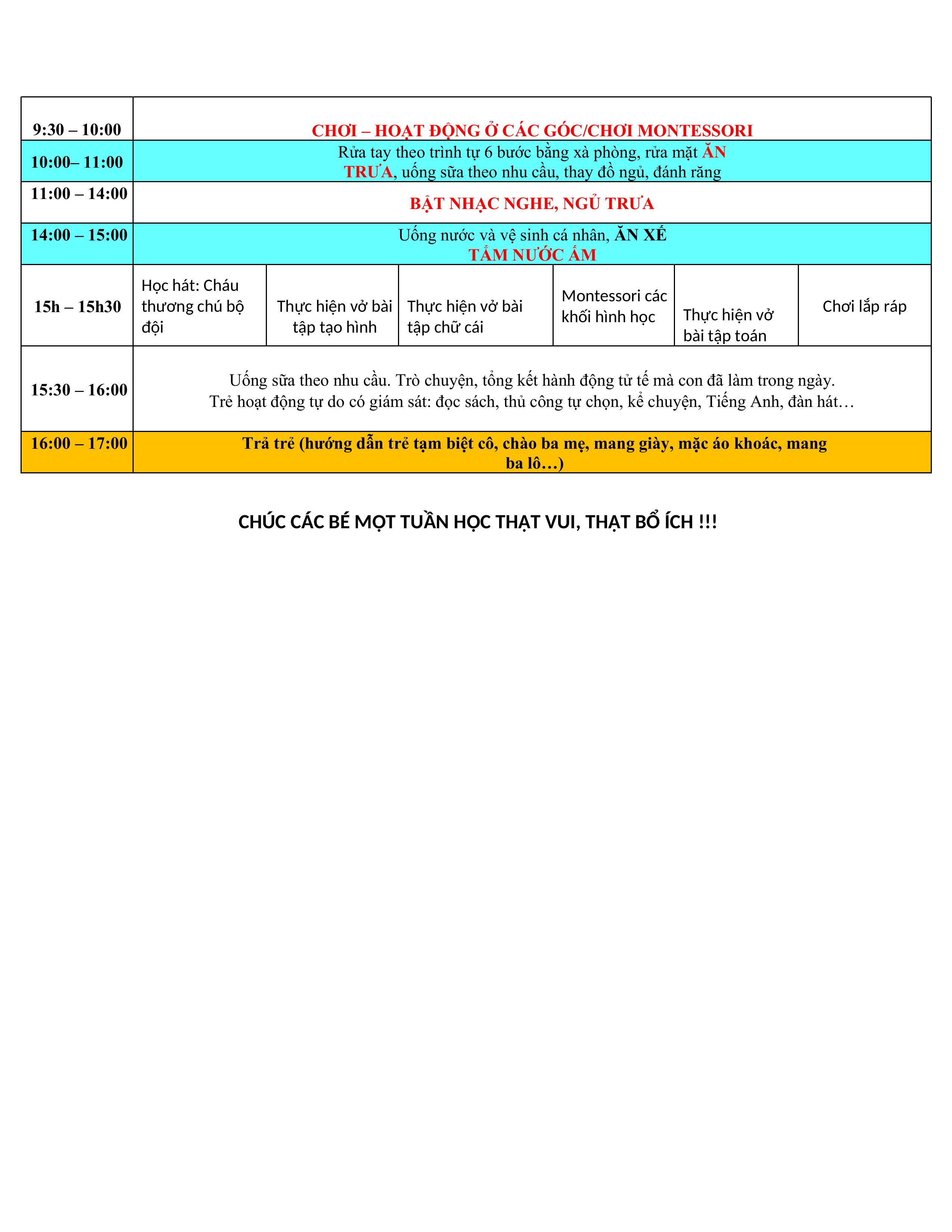 Thời khóa biểu lớp Happy 1 Tuần 2