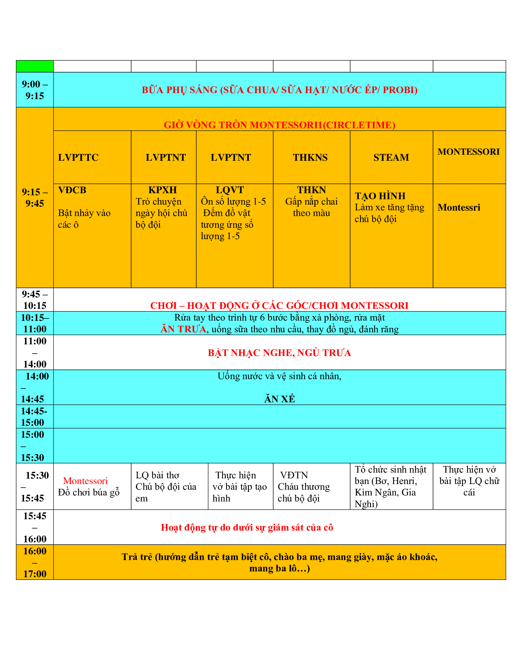 Thời Khoá Biểu Lớp Moon Tuần 2