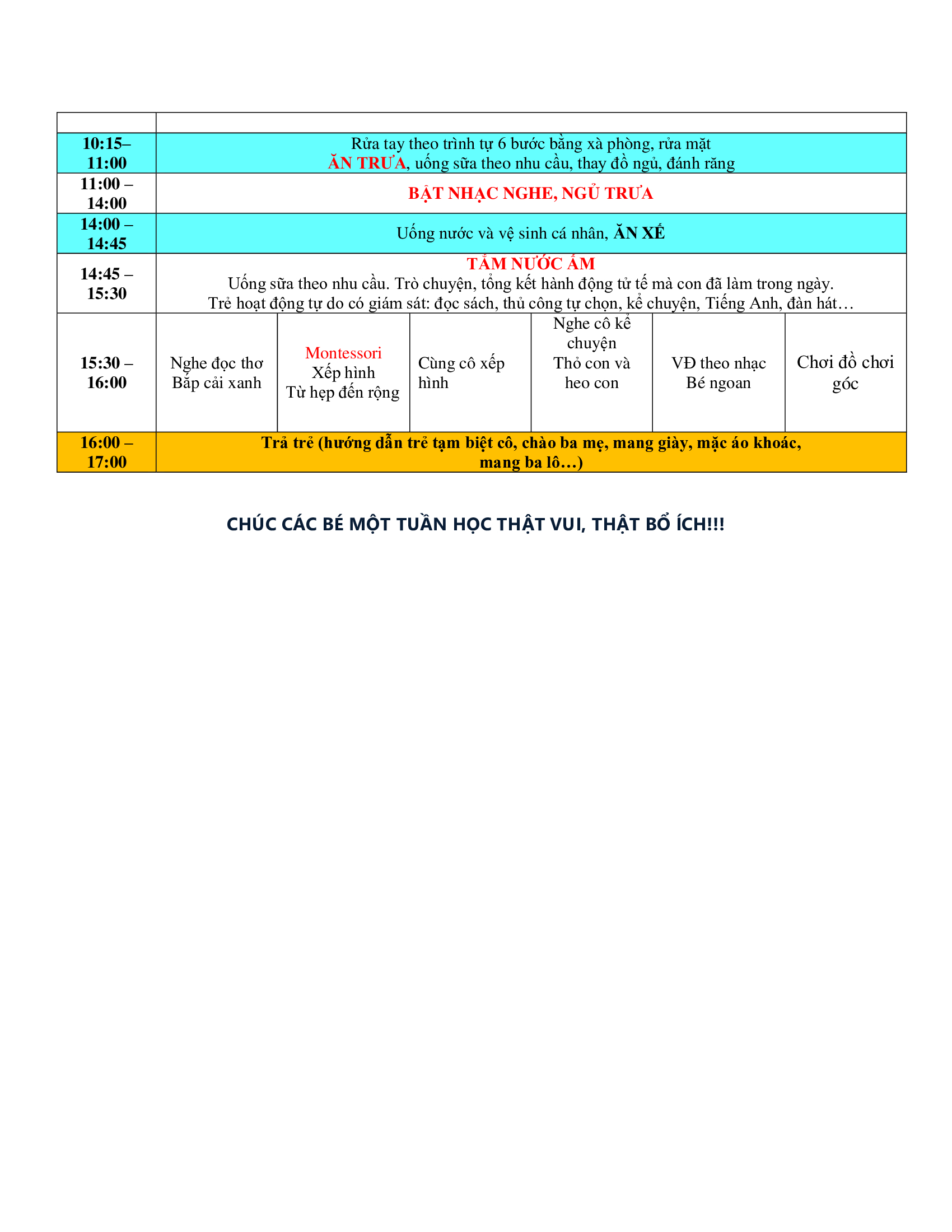 Thời Khoá Biểu Lớp Stars Tuần 1